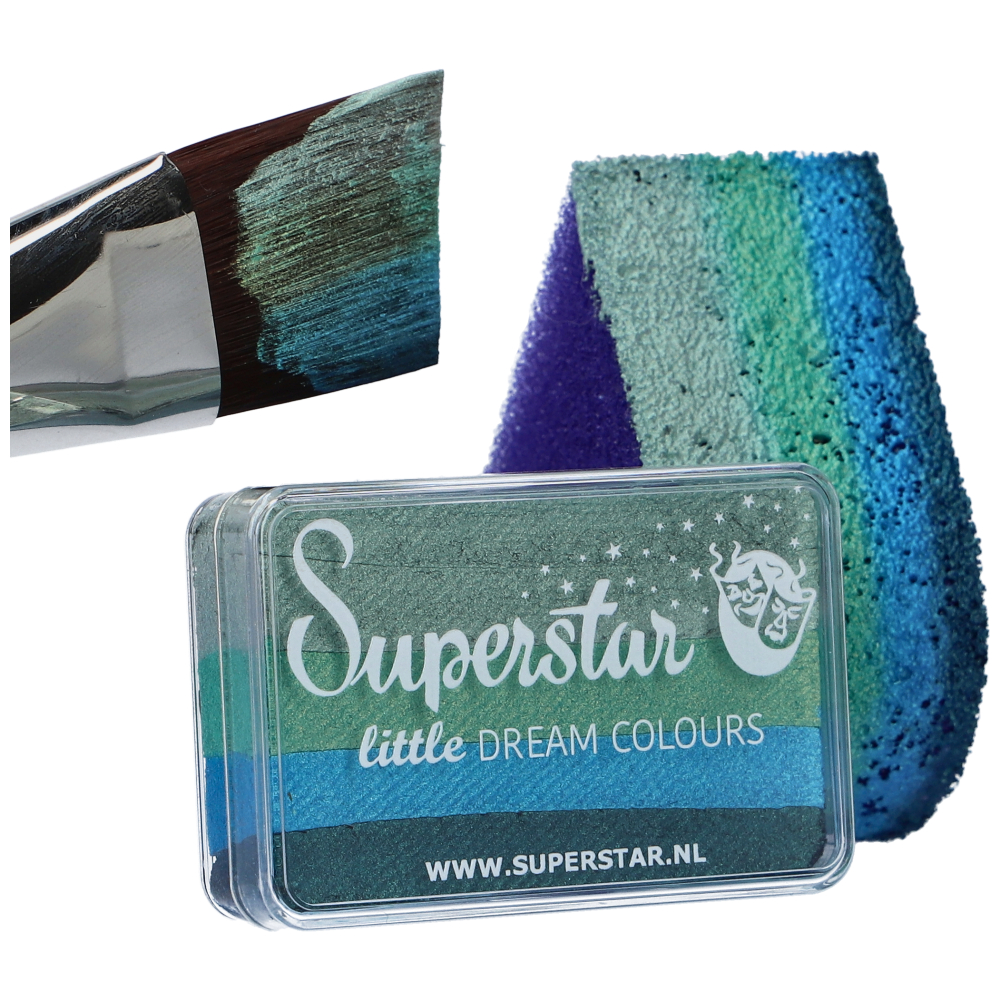 Superstar Little Dream Colours – Little Ocean is een splitcake schmink in eenhandig compact formaat. Met de 4 blauw en groen tinten is deze schmink perfect voor zeemeerminnen, oceaanwezens en fantasie-ontwerpen, zoals golven, zeeschatten en betoverende waterpatronen.