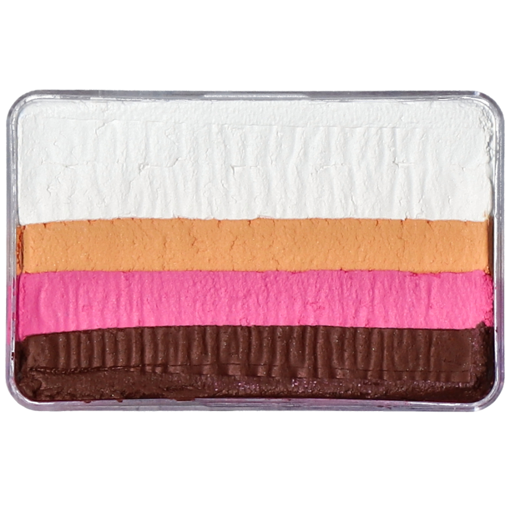 Superstar Little Dream Colours – Little Rose is een splitcake schmink in eenhandig compact formaat. Met de kleuren pruim, bubblegum, perzik en wit creëer je in één beweging prachtige overgangen. Perfect voor bloemen-, prinsessen- en elegante fantasie-ontwerpen, zoals rozen, feeën en glamoureuze schminkcreaties.